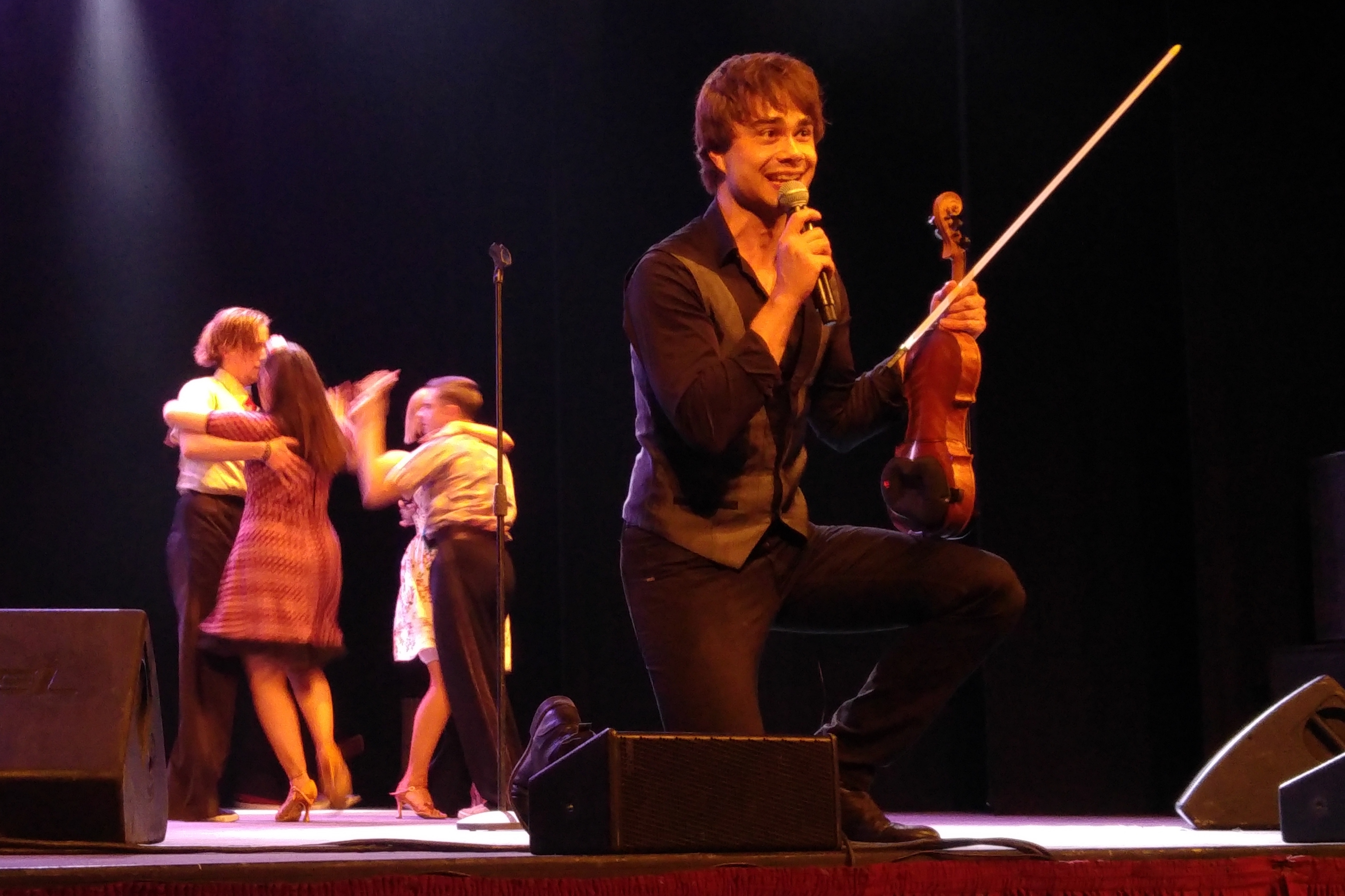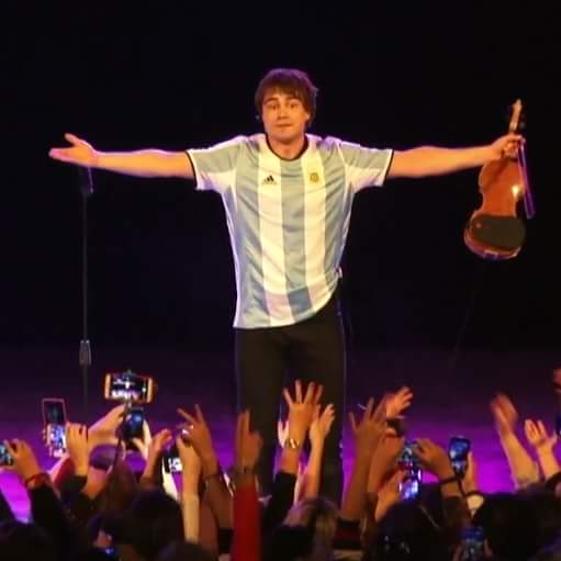 El talentoso violinista llegó a nuestro país para presentarse el pasado 29 de abril en el teatro Coliseo, donde supo imponer su particular estilo e interpretar canciones de todo género. Pop, jazz, tango, clásico y dance. Vestido de negro, con camisa y chaleco, y acompañado por bailarines, interpretó “Europe’s Skies” y “Fairytale”. Luego, fue el turno de “Abrázame”, canción de Julio Iglesias. Más tarde su reciente hit “Kotik” y acompañado del gran pianista Mario Parmisano, inicio al segmento clásico del concierto. Juntos en piano y violín interpretaron “Hungarian Suit” y “Song from a secret garden”, hermosas y emocionales melodías. Un espacio para el jazz con “Jealous” y dieron cierre a este gran segmento clásico con “Libertango” de Piazzola acompañados por los bailarines Héctor Falcón y Florencia Segura. Más tarde Alexander invitaba al escenario a parte de la “Orquesta del Centenario” con quien compartió unos temas en violín. Y llego el momento para sus hits, una canción sobre la amistad y dragones: “Into a fantasy”. Continuó con “Leave me alone”, canción que compuso para una alocada fan, acompañado por bailarines vestidos con chalecos de fuerza. Con simpatía y talento pleno más una mixtura musical permitió al auditorio comprobar porque brilla en cada escenario que se presenta en los últimos años. Cerro la noche con el cover “Do you think i’m sexy” de Rod Stewart y se animó a cantar entre el público al bajar del escenario y revolucionar la platea. Como bonus track, invitó al escenario a los bailarines y músicos invitados para juntos volver a interpretar el tema que lo consagro internacionalmente “Fairytale”.