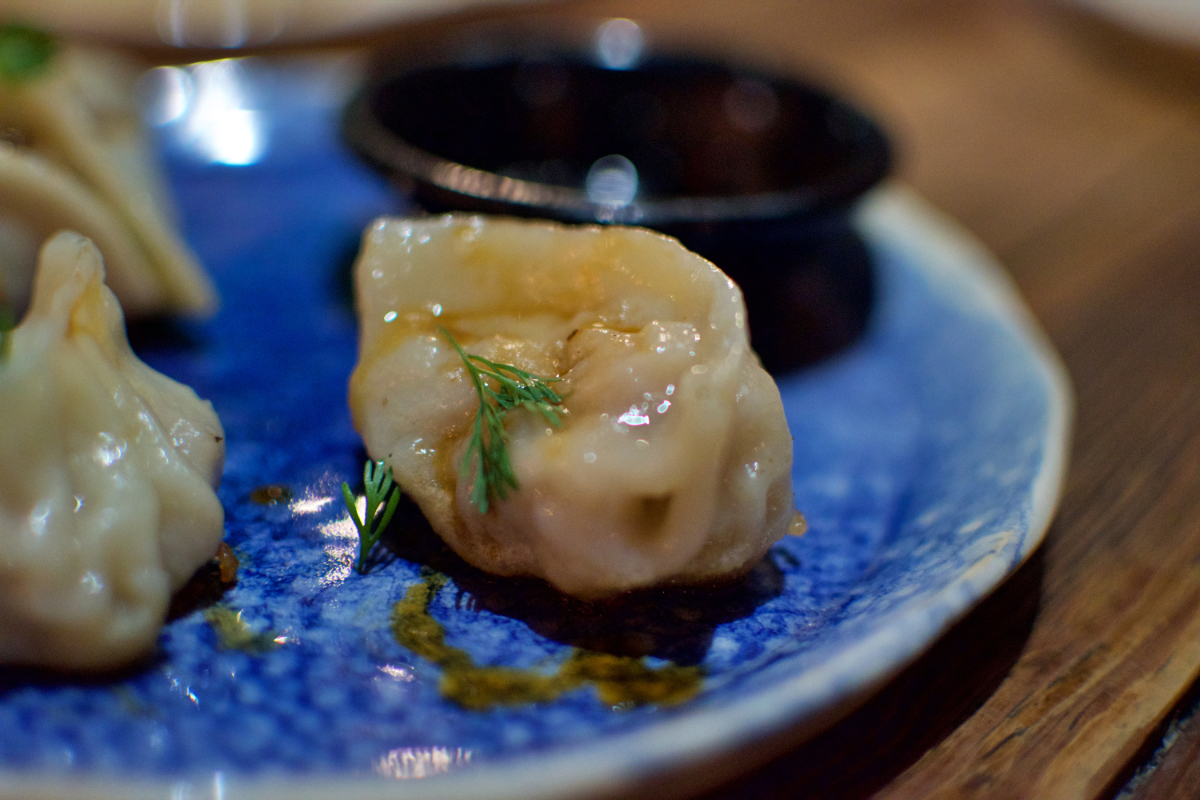 Los dumplings, armados a mano uno por uno, cocinados al vapor y terminados a la plancha, crujen justo donde deben. Hay gyoza clásica (cerdo + langostino + verdeo) y una versión veggie (poroto negro + batata + cebolla caramelizada). Pintados con soja y coronados con brotes.
