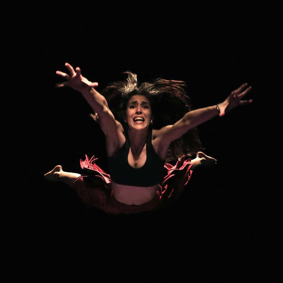 En un espacio con fondo negro, caen dos telas de colores, y dos negras, y son las que usan para contar desde el aire, colgados, parte de esta historia, con algunas frases, y con mucho desplazamiento.
