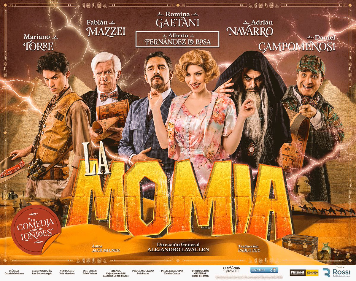 La Momia es una obra que se destaca por las interpretaciones de todos los actores. La historia, el guión, es simple, es una obra para divertir a toda la familia; sacándole las partes “pícaras”, podría ser una obra para niños. Esta obra fue un éxito rotundo en Londres, y llega al país con producción de Diego Feldman, y  música de Gabriel Goldman. Nos habla de una maldición egipcia: un hombre de 5 mil años regresa… en busca de un antiguo amor, y la tumba de la reina Tera serán los armazones para esta comedia: una mano con siete dedos, un anillo, una poción mágica, junto a antiguos pergaminos y maldiciones por descifrar…
