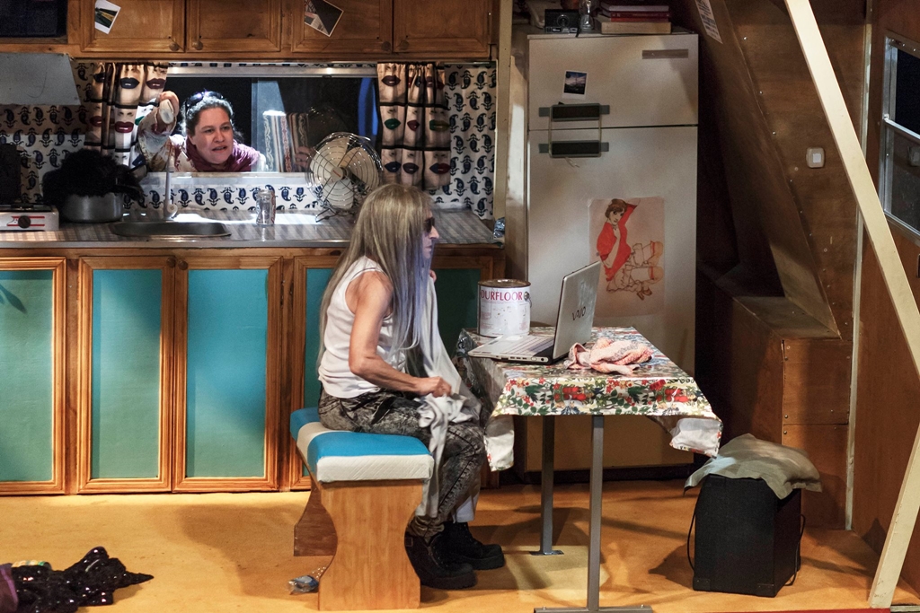 El grupo actoral es soberbio, lograr llevar adelante tres personajes difíciles tanto en lo físico como en diálogos es algo sublime para destacar. La comunicación verbal no es lo que prioriza en esta dramaturgia ya que dos personajes hablan en idiomas extranjeros o desconocidos. Paula Rasenberg en un rol tibio al principio pero importante con el desarrollo de la pieza, soprende gratamente por su destreza física y su expresionismo innato al enseñarnos que se puede comunicar sin necesidad de los diálogos si se lo hace con emotividad y alta dosis de gracia. Marta Lubos en un papel de estética arrolladora y personalidad fuerte nos aleja claramente de la imagen de nuestras tías o abuelas que estamos acostumbrados, sin dejar de producir comicidad durante varios pasajes escénicos. Y Daniela Pal, puramente emocional, natural y cómica complementa perfecto al trió en este mundo femenino y audaz que reina en la obra. Algo notable es la música en vivo del artista Joaquín Segade, quien con su guitarra u otros instrumentos logra un clima y marco extraordinario para la acción que se da sobre una escenografía sorprendente que se ha logrado, la sala mayor de timbre4 se ha transformado en un paraje desconocido donde un motorhome sirve de casa para las protagonistas, diseñado por Gonzalo Córdoba Estévez, quien mas allá de los precisos detalles sorprende por las puertas y pasadizos secretos que se descubren segundo a segundo.