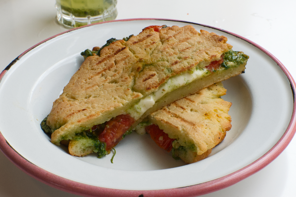 Probamos varias opciones del menú y todas mantienen la misma línea: sabores cuidados, porciones generosas y una presentación impecable. El tostado en pan de chipa —con queso cremoso, tomates cherry confitados y pesto— es uno de los favoritos de la casa y se entiende por qué. El sándwich de pollo, servido en pan de campo con champiñones, cebolla caramelizada, queso, manteca de ajo y rúcula, es contundente y prolijo: no se desarma y es sabrosísimo, acompañado de unas papas que completan la experiencia.