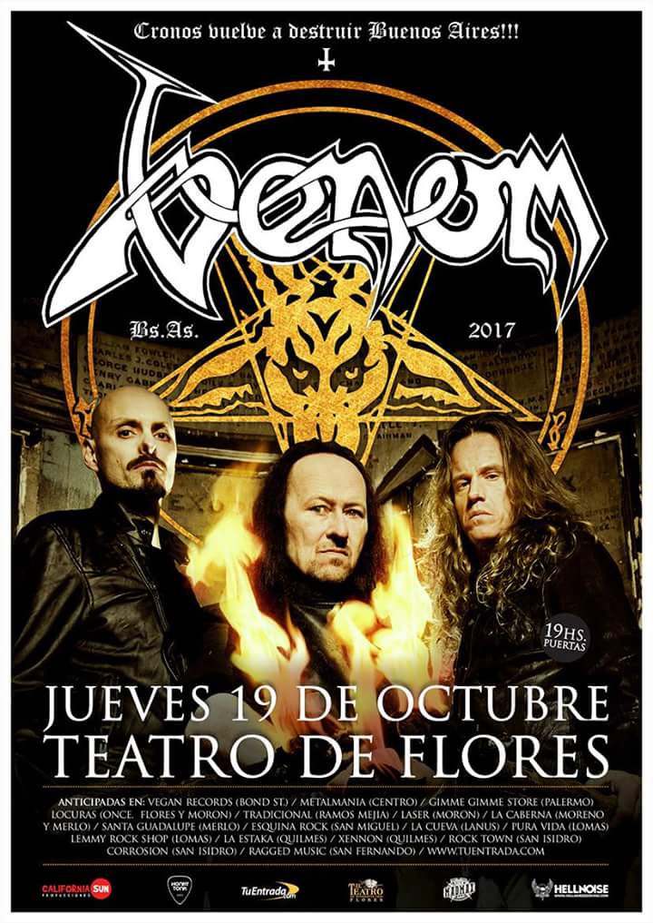 Venom la mítica banda inglesa, considerada precursora del black metal se presentara el jueves 19 de octubre en el “Teatro Flores”, Av. Rivadavia 7806, Flores. En esta oportunidad tocaran temas de su nueva placa “Black Mass” y clásicos de discos como “Welcome to Hell”, “Black Metal”, “At War with Satan” y “Possessed” entre otros.