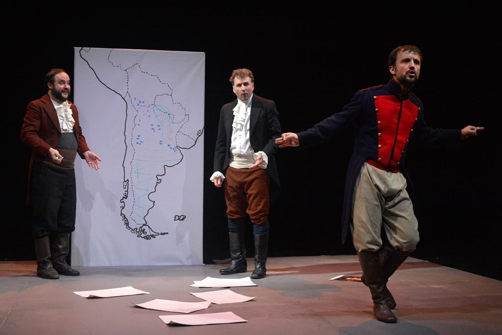 Un escenario casi vacío, tan solo adornado por un mapa en blanco de la república argentina y sus países limítrofes y tres personajes, vestido a la usanza de la época, nos reciben al ingresar a la sala.
