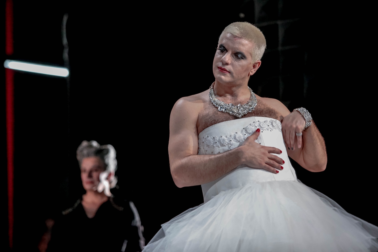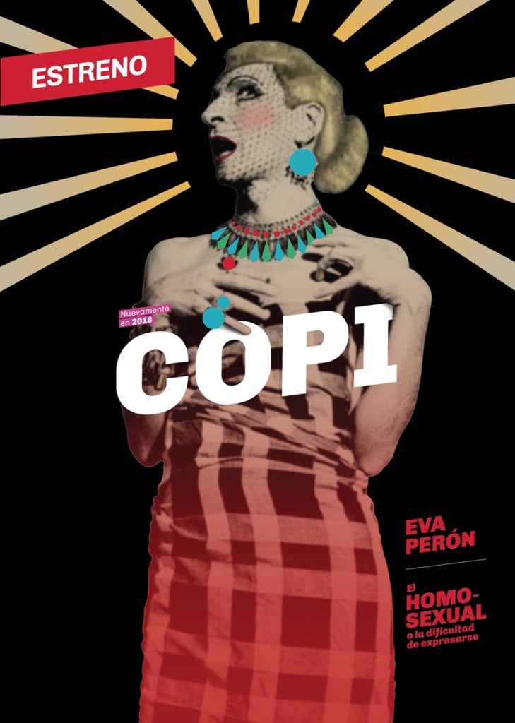 Luego viene un intermedio, planteado como un “número vivo” de entreacto con la voz misma de Copi, primero encarnada en Gustavo Liza, clásico performer transformista de la escena porteña desde hace décadas. Como mencionamos antes, las palabras de Copi permiten desentrañar un poco mejor las intenciones del texto anterior, y la elección de Liza les agrega cierta urgencia y un efecto, seguramente buscado, de incomodidad. Es necesaria la desconexión entre las palabras del autor y el actor que las dice para no juzgar como una exposición anacrónica a todo el segmento. Un momento de mímica y una coreografía de tango completan la escena antes de unas palabras en la misma voz de Copi, en francés, hablando sobre Eva Perón.
