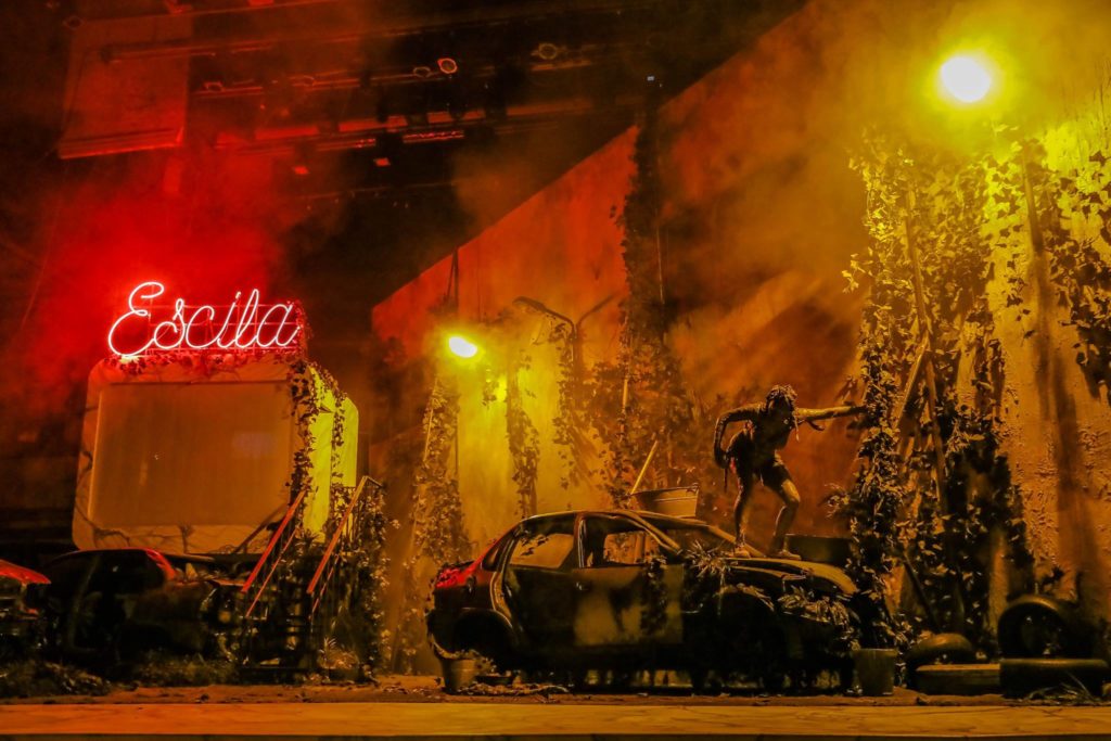 Ante esta propuesta estética, el texto de Séneca pasa a un segundo plano. Durante la primer escena de la obra, un grupo comando de niñas, hartas del maltrato de los adultos, decide vengar los crímenes de la infancia y secuestran a payasos y Teletubbies. La escenografía de una ciudad en ruinas, con autos derruidos y monstruos que se esconden y aparecen, es imponente, aun para el teatro oficial. Es recién en la segunda escena donde la tragedia de Tiestes y Atreo comienza. De un modo particular, por supuesto, teniendo en cuenta el carácter vanguardista del teatro de García Wehbi, quien hacia fines de los años ‘80 fue uno de los fundadores el grupo teatral Periférico de Objetos.